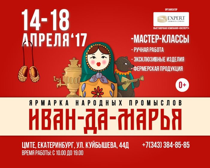 Ярмарка «Иван-да-Марья» — известный и узнаваемый проект уже далеко за пределами Урала. Несколько раз в год в Екатеринбурге собираются мастера со всей России и ближнего Зарубежья для того, чтобы познакомить горожан с многообразием уникальных изделий, творчеством и необычными находками, созданные в единственном экземпляре. Переосмысление традиционных мотивов, понятий для мастеров – повод и причина для формальных экспериментов, когда создаются невероятные по красоте и тщательно проработанные произведения, передающие неповторимую индивидуальность мастера. Большинство произведений, собранных со всей России, вы сможете встретить только на нашей выставке.