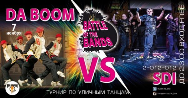 «BATTLE OF THE BANDS» - это самый настоящий безжалостный и беспощадный танцевальный замес. Это не конкурс, это не чемпионат - это БИТВА. Никаких правил, никаких ограничений, только танцы, только шоу. Крупнейшие танцевальные школы Екатеринбурга, сильнейшие коллективы и команды из других городов Урало-Сибирского региона будут биться за титул богов танцпола. Ни каких судей, один на один. Первый батл состоится уже в пятницу, 7 ноября и будет проходить каждую неделю в течении полугода.